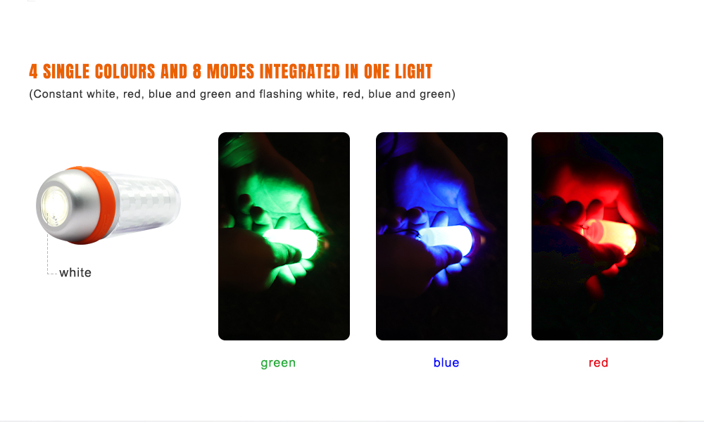 The OrcaTorch SD03 is a compact and multifunctional 4-colour dive beacon. It can emit light in 4 different colours and has 8 lighting modes: for each colour either constant light or flashing mode. Both colour and light mode can be chosen by rotating the body. The SD03 can be used as an underwater or outdoor signal light, dive backup light, outdoor regular light, etc. Its shell is made of plastic which provides good light penetration. With excellent waterproofness, it will function up to 100m underwater. There is no doubt that the SD03 is one of the best choices for diving or outdoor lighting.