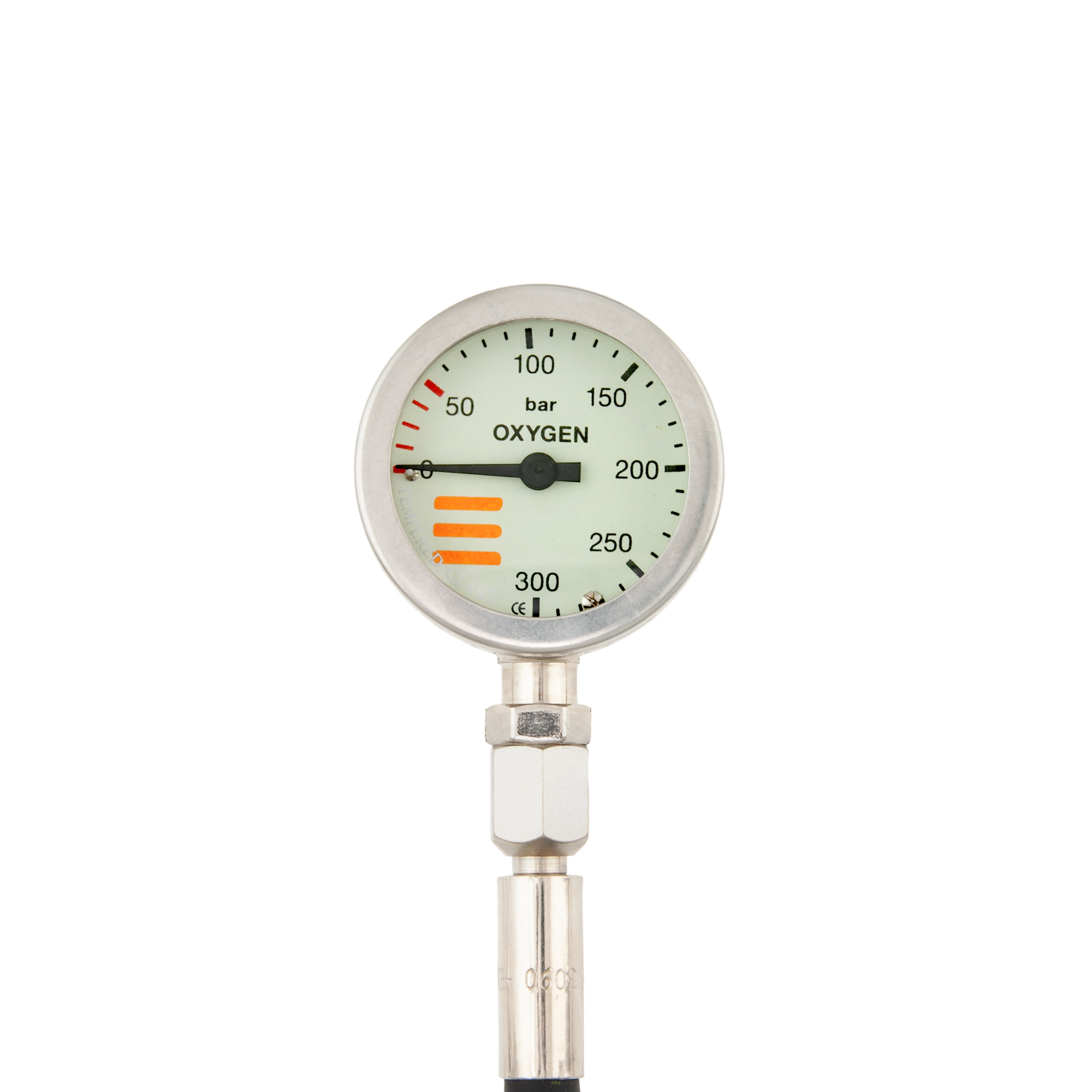 SPG diam 52 mm O2, scale 300 bar, working pressure 230 bar, 15 cm HP hose, without cover.